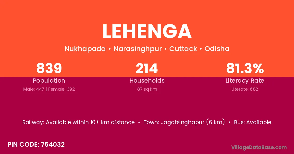 Jagatsinghapur (6 km) is the nearest town to Lehenga village for major economic activities and is located approximately 6 km away.