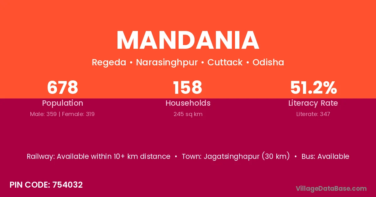 Jagatsinghapur (30 km) is the nearest town to Mandania village for major economic activities and is located approximately 30 km away.