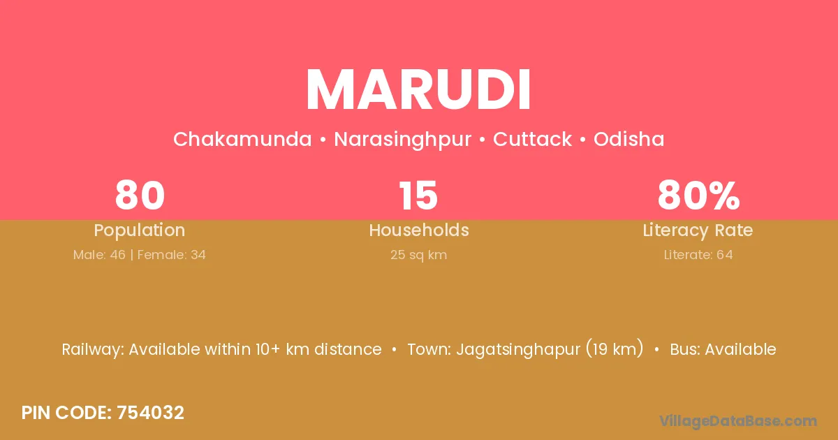 Jagatsinghapur (19 km) is the nearest town to Marudi village for major economic activities and is located approximately 19 km away.