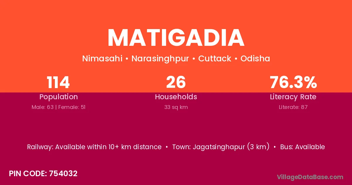 Jagatsinghapur (3 km) is the nearest town to Matigadia village for major economic activities and is located approximately 3 km away.