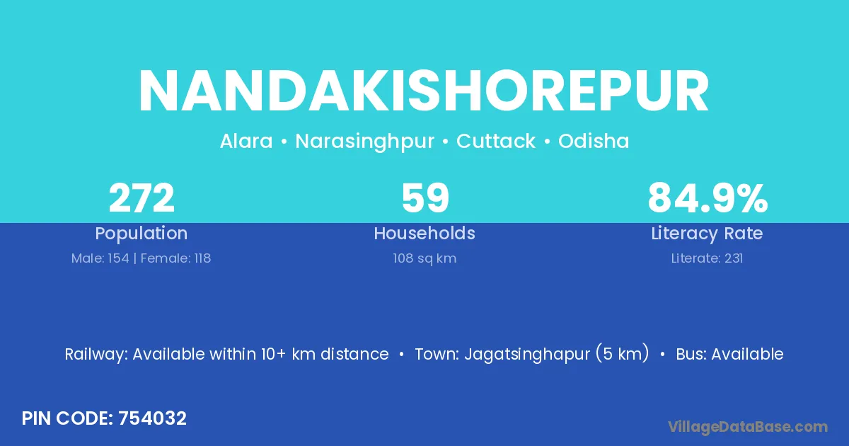 Jagatsinghapur (5 km) is the nearest town to Nandakishorepur village for major economic activities and is located approximately 5 km away.