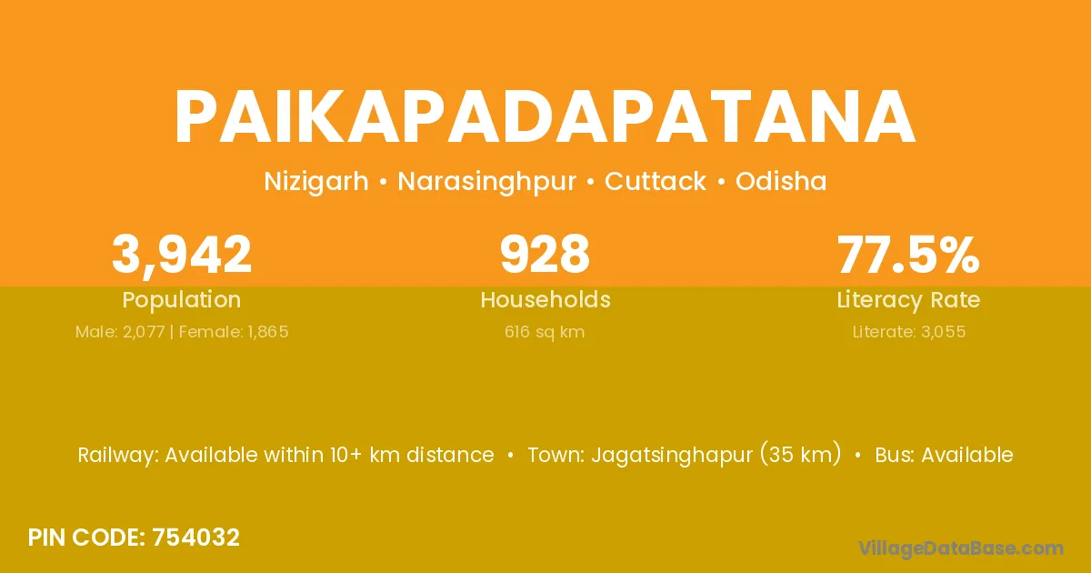 Jagatsinghapur (35 km) is the nearest town to Paikapadapatana village for major economic activities and is located approximately 35 km away.