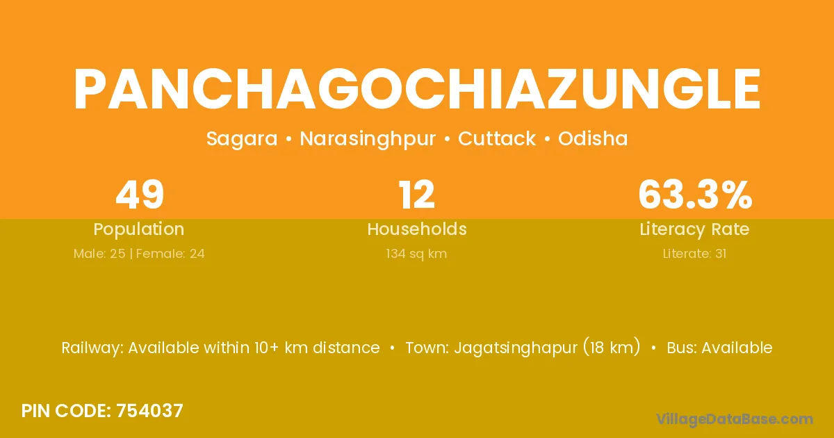 Jagatsinghapur (18 km) is the nearest town to Panchagochiazungle village for major economic activities and is located approximately 18 km away.
