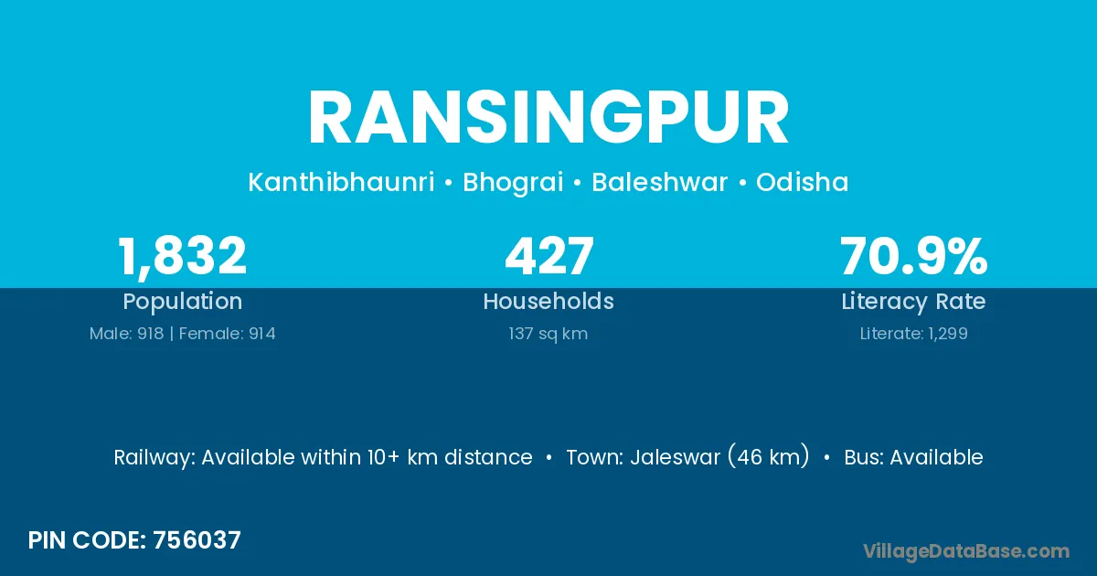 Jagatsinghapur (3 km) is the nearest town to Ransingpur village for major economic activities and is located approximately 3 km away.