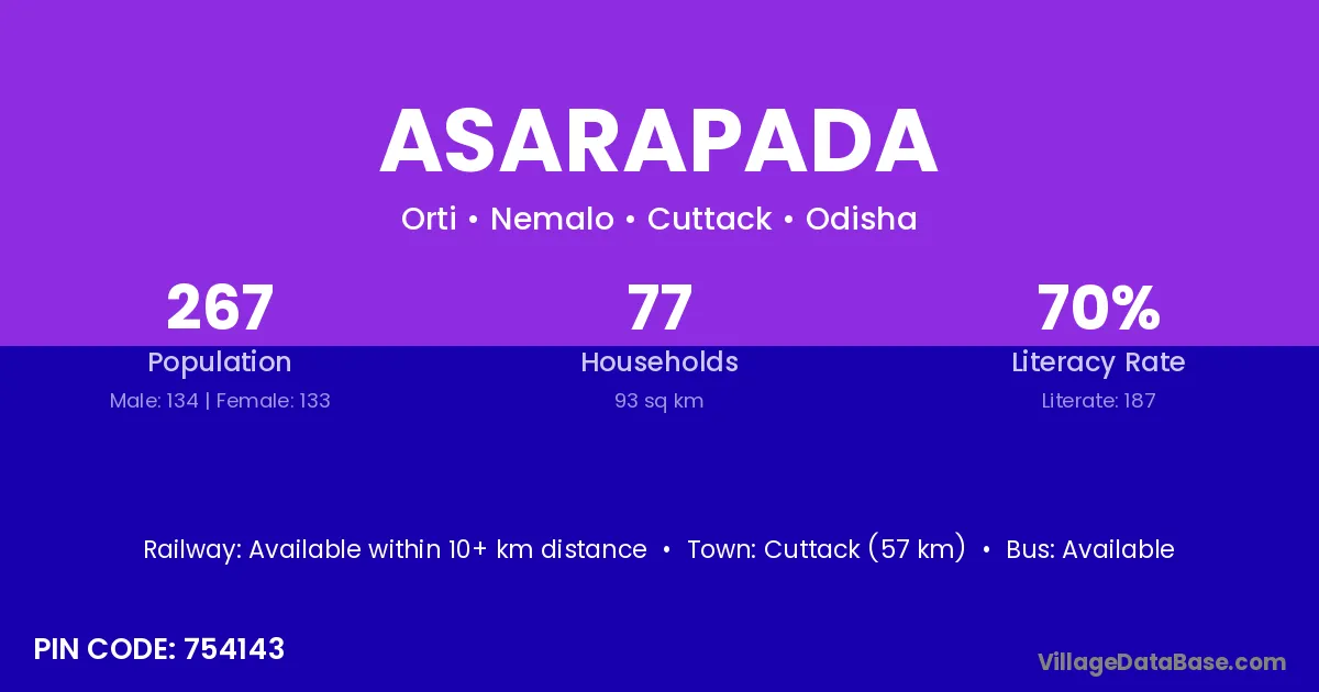 Asarapada village has a total population of 267 people, of which 134 are males and 133 are females.
