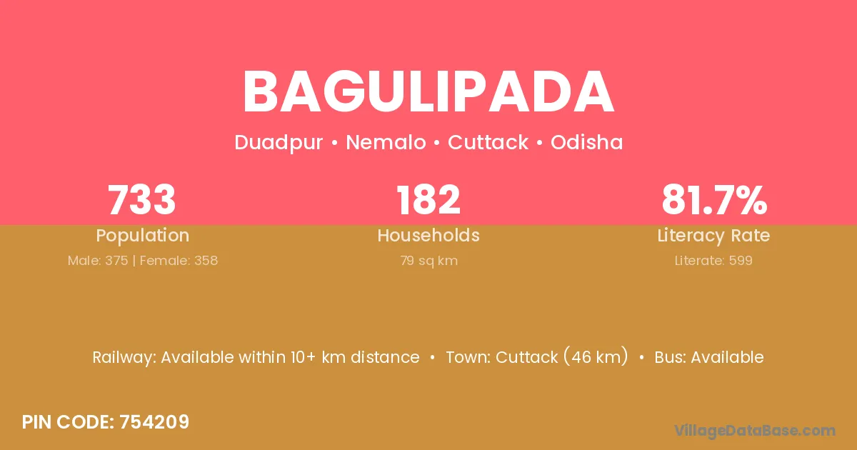 Cuttack (46 km) is the nearest town to Bagulipada village for major economic activities and is located approximately 46 km away.