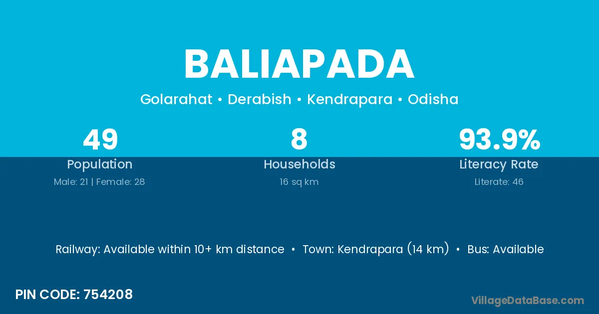 Cuttack (41 km) is the nearest town to Baliapada village for major economic activities and is located approximately 41 km away.