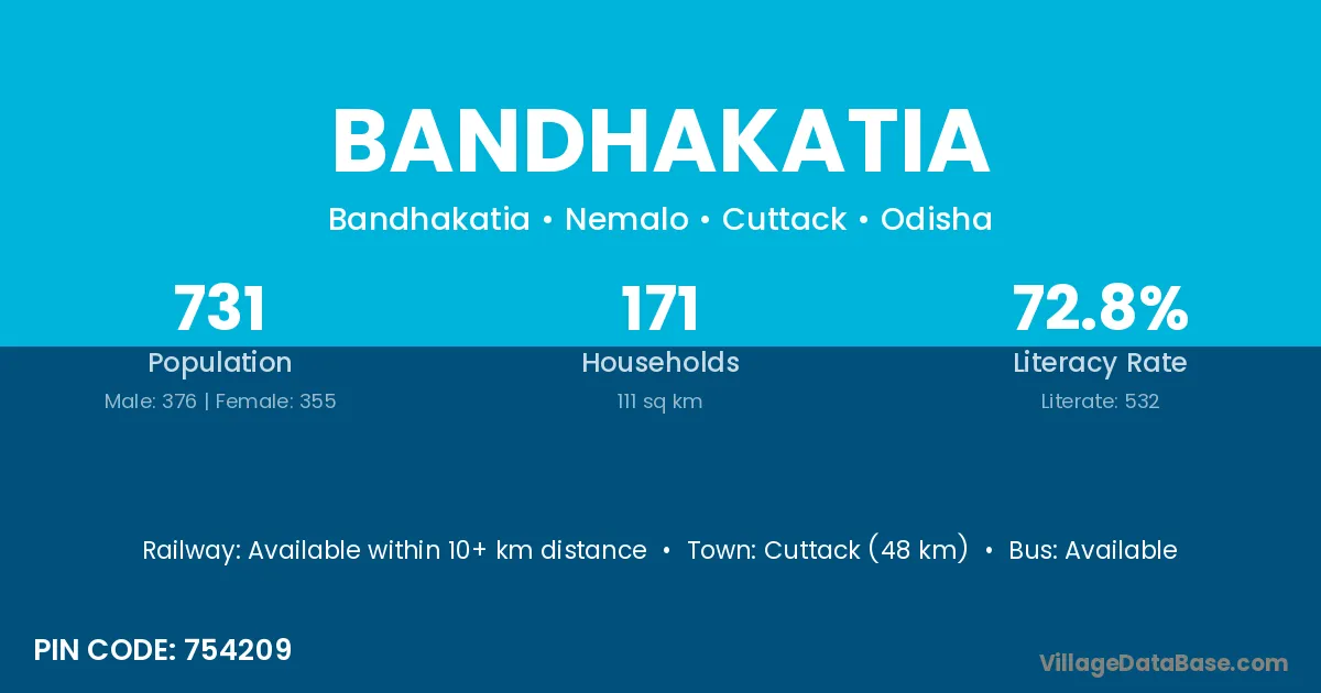 Cuttack (48 km) is the nearest town to Bandhakatia village for major economic activities and is located approximately 48 km away.