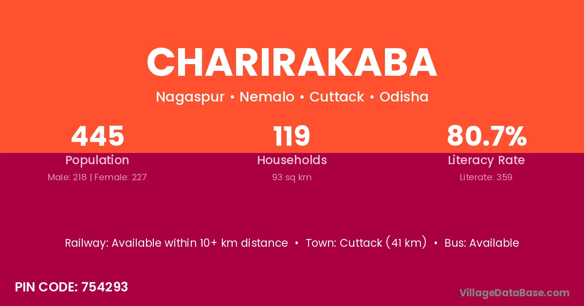 Cuttack (41 km) is the nearest town to Charirakaba village for major economic activities and is located approximately 41 km away.