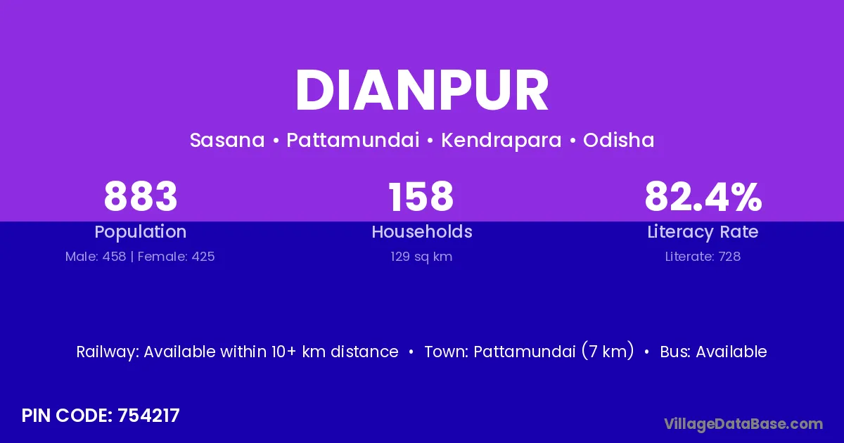 Cuttack (52 km) is the nearest town to Dianpur village for major economic activities and is located approximately 52 km away.