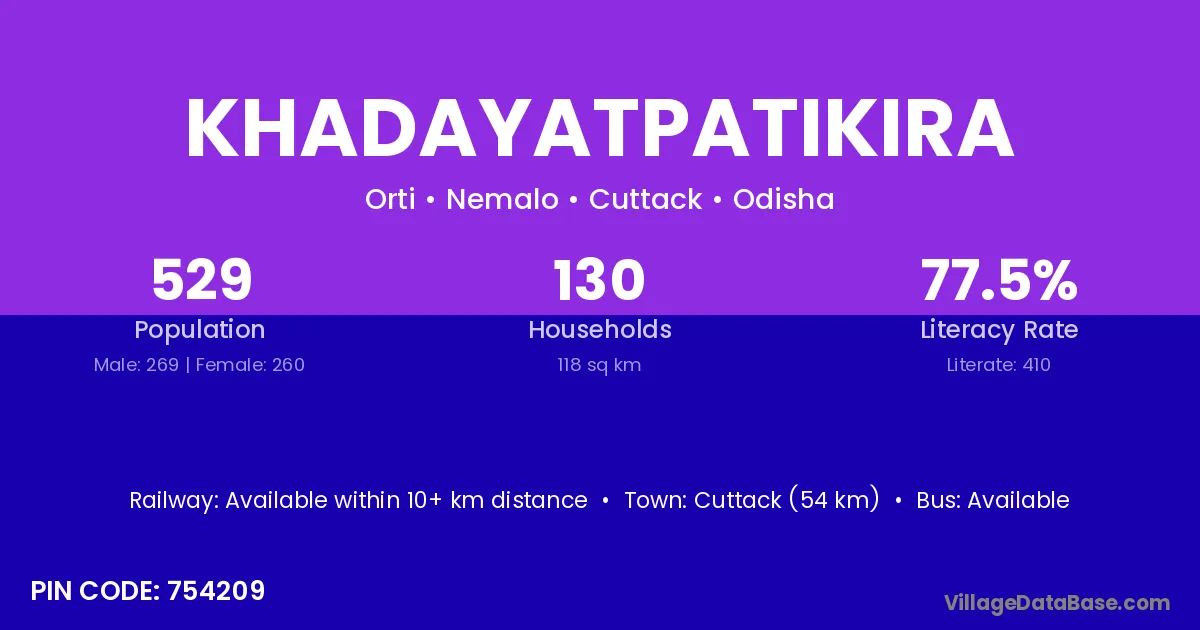 Cuttack (54 km) is the nearest town to Khadayatpatikira village for major economic activities and is located approximately 54 km away.