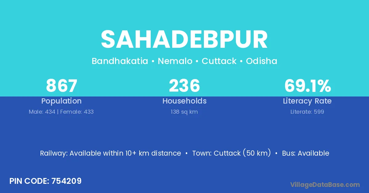 Cuttack (50 km) is the nearest town to Sahadebpur village for major economic activities and is located approximately 50 km away.