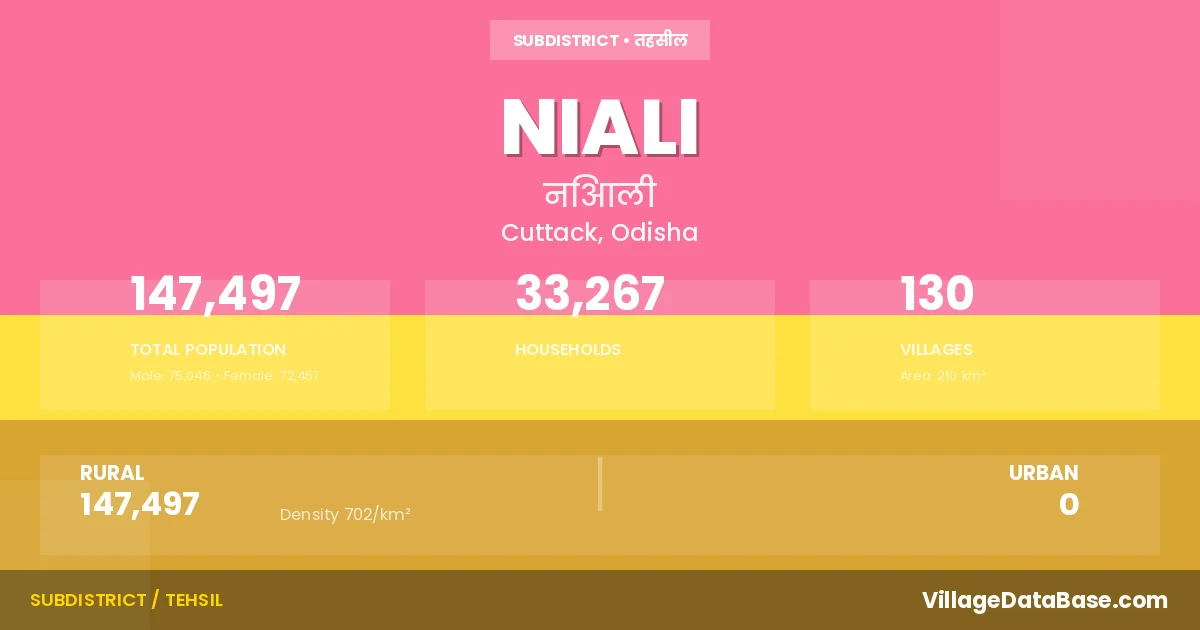 According to the 2011 census The total area of Niali Tehsil is 210 km², with a population of 147497 people. The population density is 702 inhabitants per square kilometre, and there are approximately 33267 houses in the sub district.