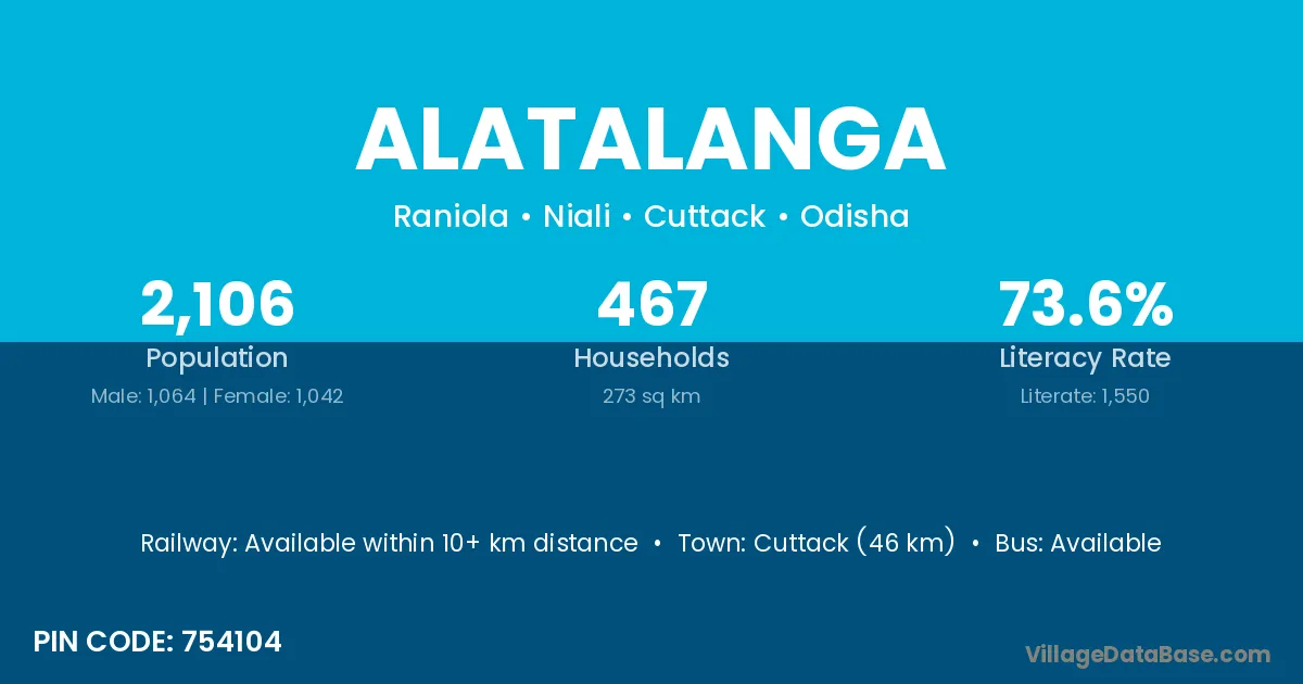 Cuttack (46 km) is the nearest town to Alatalanga village for major economic activities and is located approximately 46 km away.