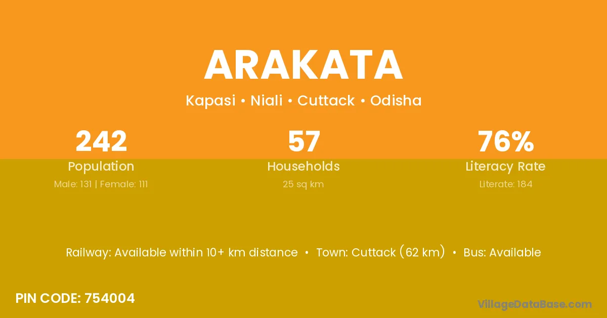 Cuttack (62 km) is the nearest town to Arakata village for major economic activities and is located approximately 62 km away.