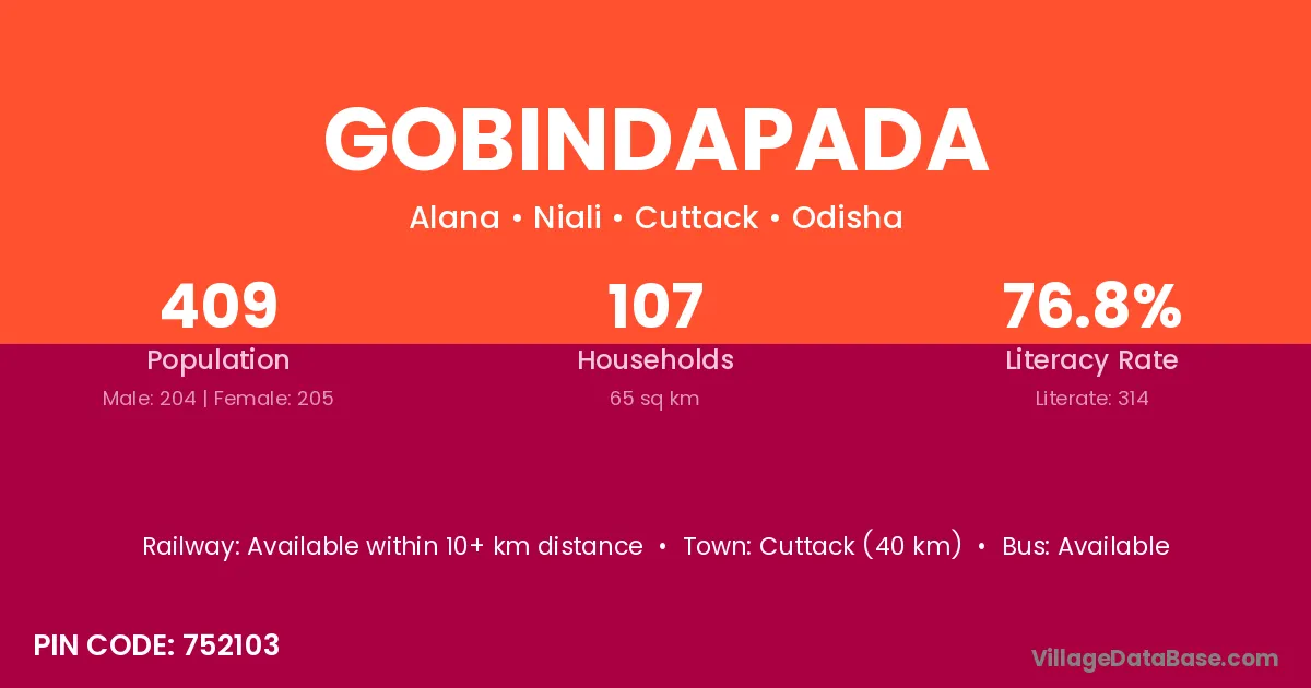 Cuttack (40 km) is the nearest town to Gobindapada village for major economic activities and is located approximately 40 km away.