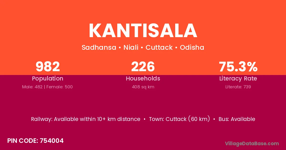 Cuttack (60 km) is the nearest town to Kantisala village for major economic activities and is located approximately 60 km away.