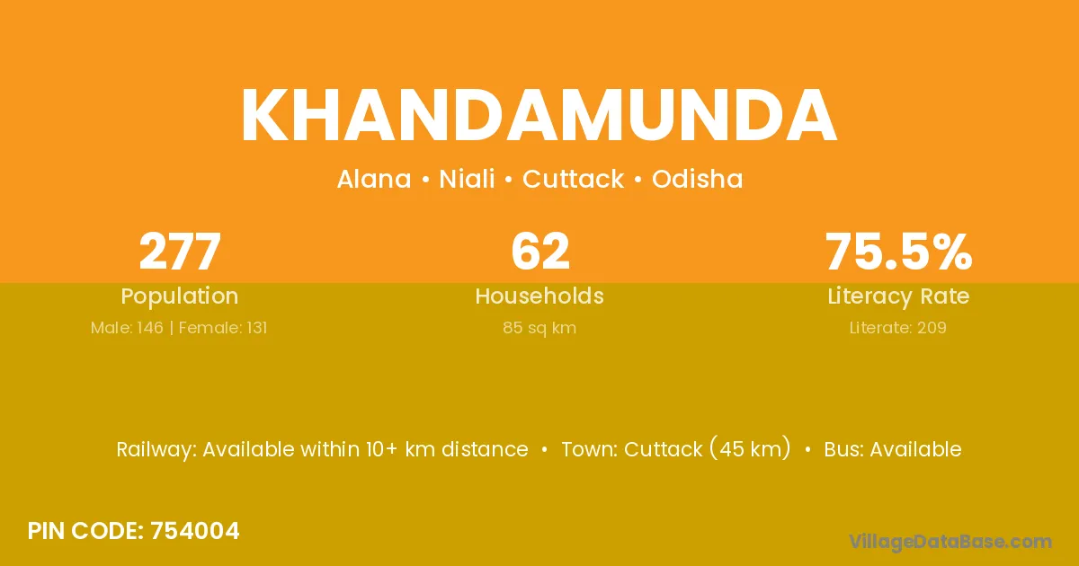 Cuttack (45 km) is the nearest town to Khandamunda village for major economic activities and is located approximately 45 km away.
