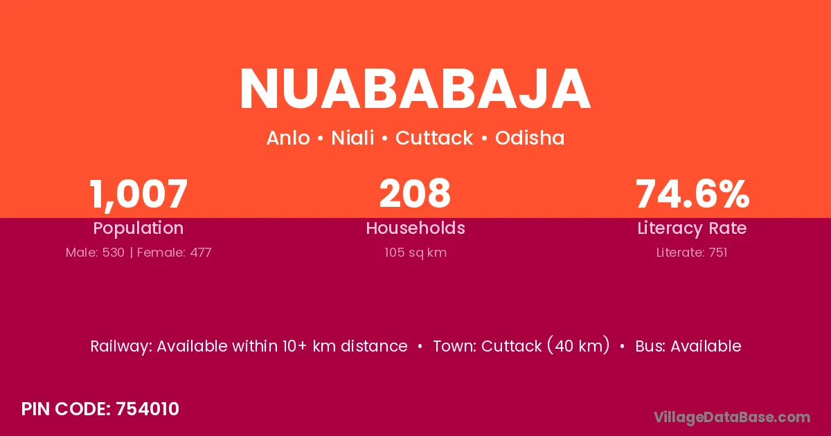 Cuttack (40 km) is the nearest town to Nuababaja village for major economic activities and is located approximately 40 km away.