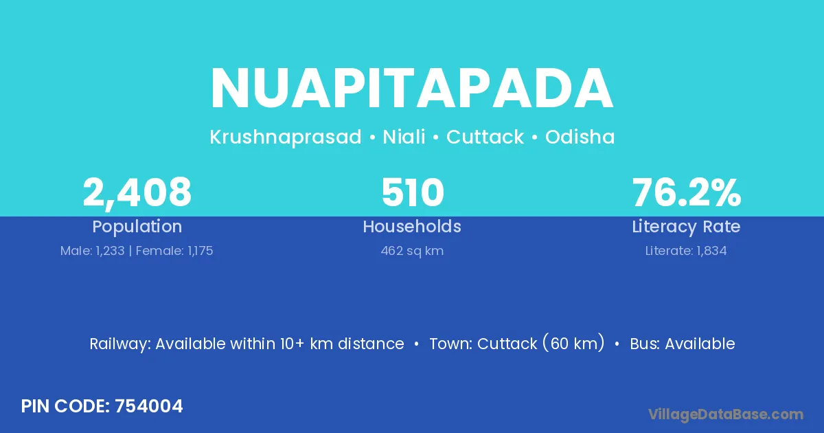 Cuttack (60 km) is the nearest town to Nuapitapada village for major economic activities and is located approximately 60 km away.