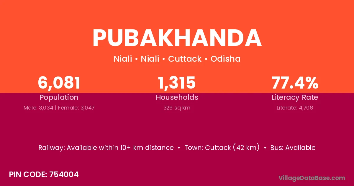 Pubakhanda village has a total population of 6,081 people, of which 3,034 are males and 3,047 are females.