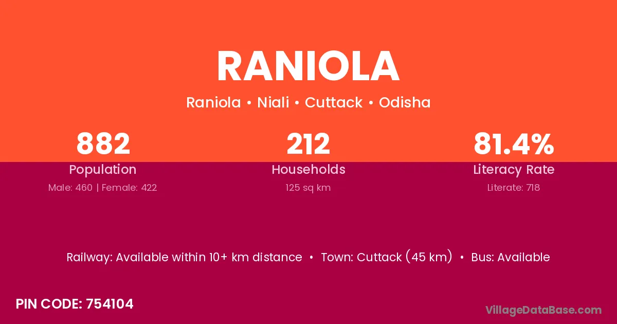 Cuttack (45 km) is the nearest town to Raniola village for major economic activities and is located approximately 45 km away.