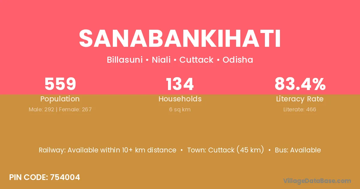 Cuttack (45 km) is the nearest town to Sanabankihati village for major economic activities and is located approximately 45 km away.