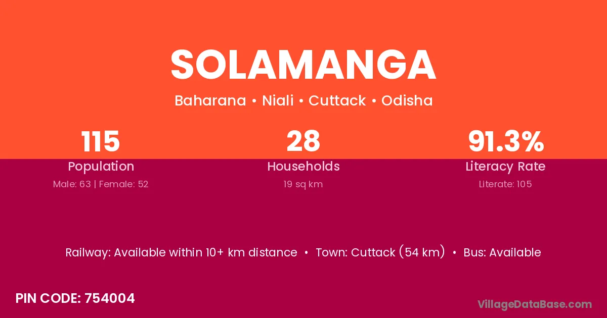 Cuttack (54 km) is the nearest town to Solamanga village for major economic activities and is located approximately 54 km away.