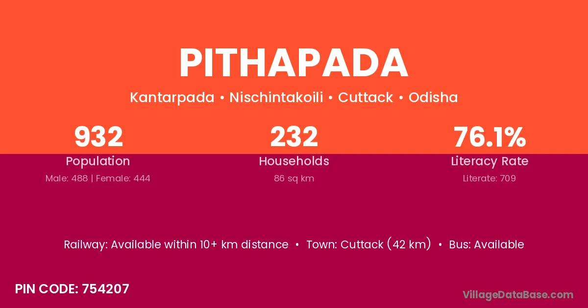 Cuttack (42 km) is the nearest town to Pithapada village for major economic activities and is located approximately 42 km away.