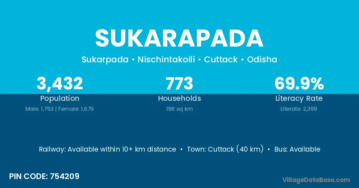 Cuttack (40 km) is the nearest town to Sukarapada village for major economic activities and is located approximately 40 km away.