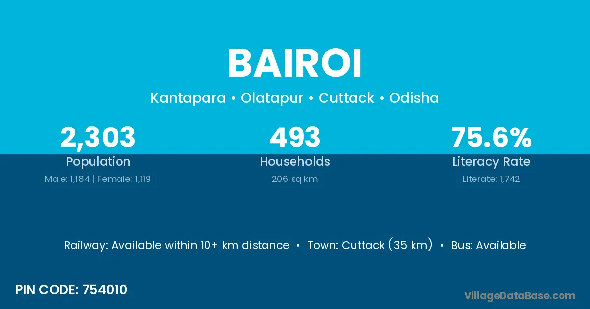 Cuttack (35 km) is the nearest town to Bairoi village for major economic activities and is located approximately 35 km away.