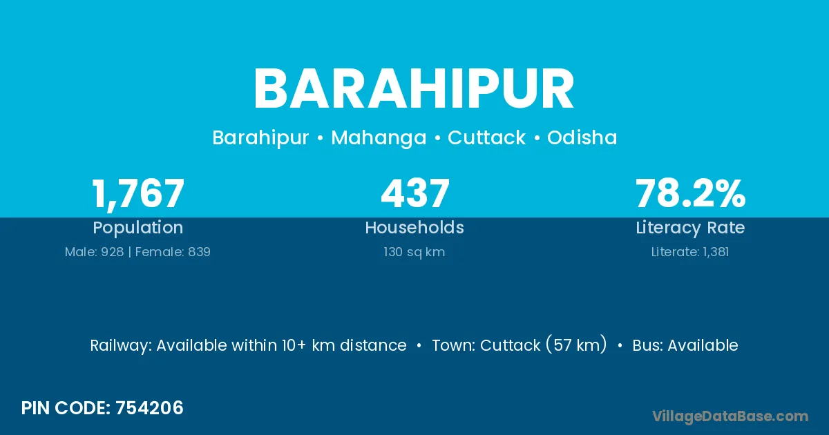Cuttack (35 km) is the nearest town to Barahipur village for major economic activities and is located approximately 35 km away.