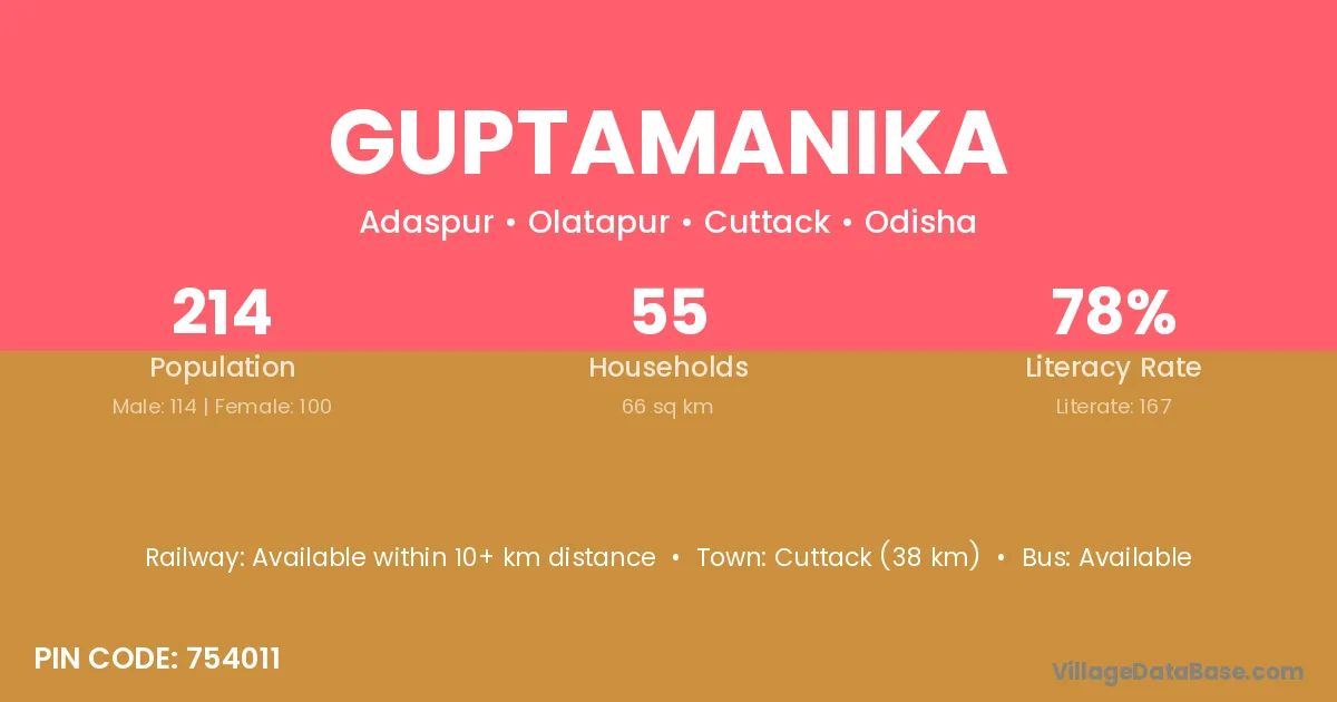 Cuttack (38 km) is the nearest town to Guptamanika village for major economic activities and is located approximately 38 km away.