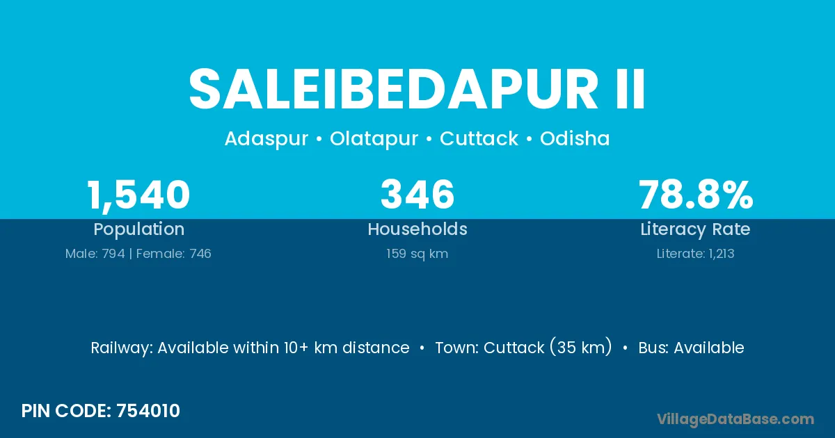 Cuttack (35 km) is the nearest town to Saleibedapur Ii village for major economic activities and is located approximately 35 km away.