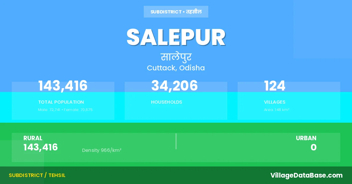 Salepur is a town and Tehsil in the Cuttack district of the Odisha. In India, a Tehsil is a subdivision of a district responsible for the administration and revenue collection of a specific area within the district. Tehsils play a crucial role in the local governance structure, contributing significantly to the development and administration of their communities.