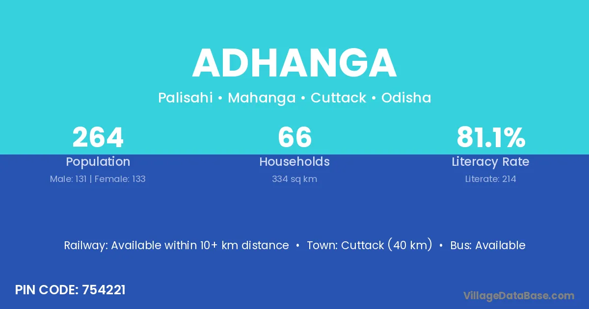 Cuttack (30 km) is the nearest town to Adhanga village for major economic activities and is located approximately 30 km away.