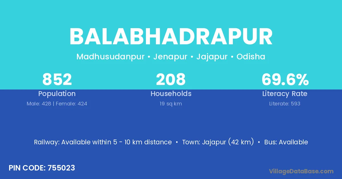 Balabhadrapur village has a total population of 1,424 people, of which 708 are males and 716 are females.
