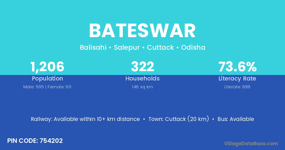 Cuttack (20 km) is the nearest town to Bateswar village for major economic activities and is located approximately 20 km away.