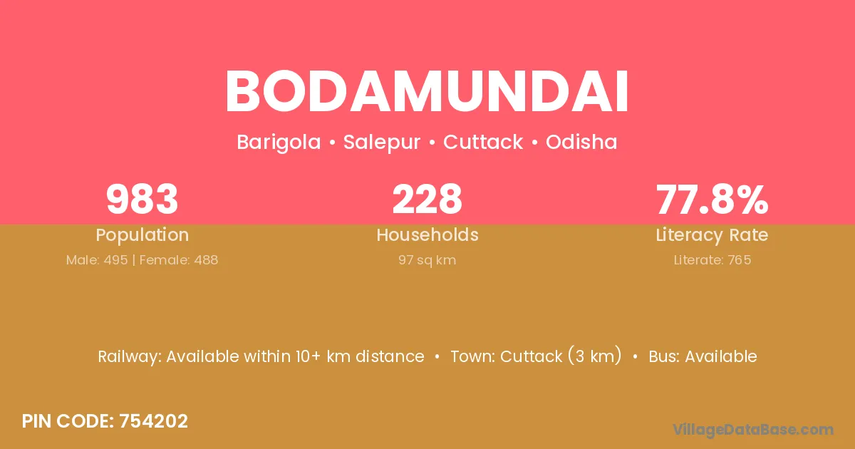 Cuttack (3 km) is the nearest town to Bodamundai village for major economic activities and is located approximately 3 km away.