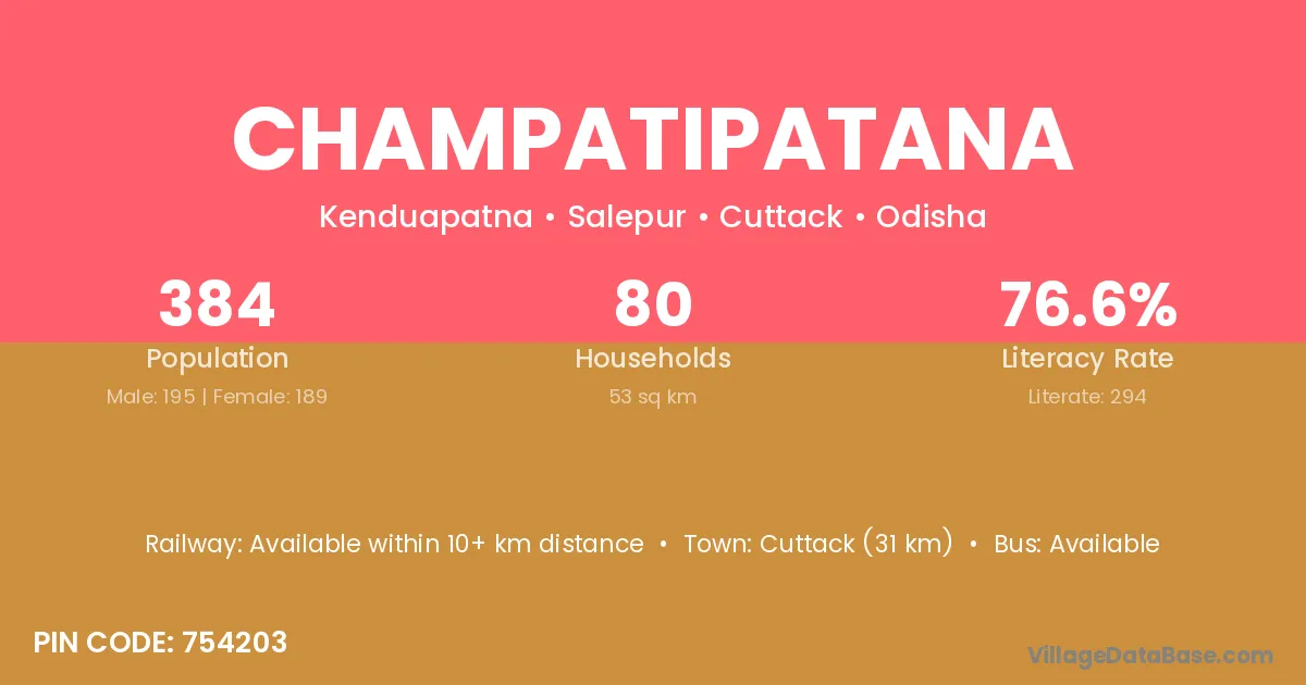 Cuttack (31 km) is the nearest town to Champatipatana village for major economic activities and is located approximately 31 km away.