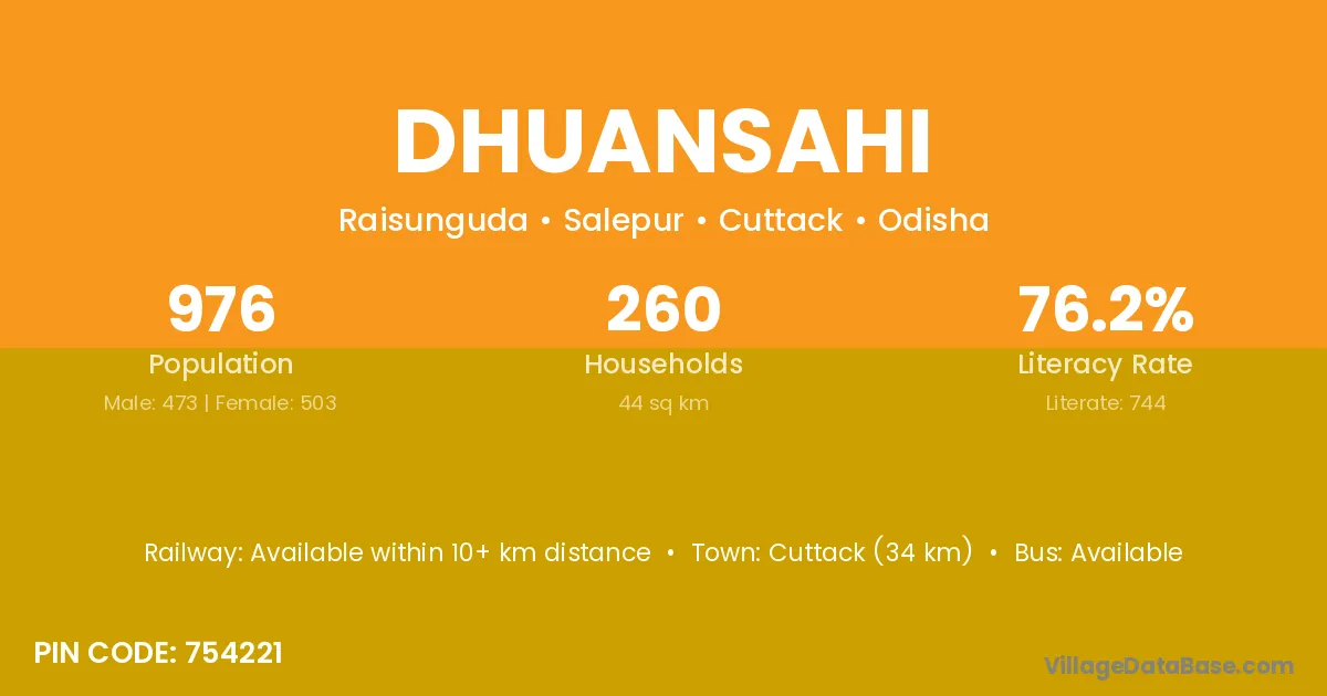 Cuttack (34 km) is the nearest town to Dhuansahi village for major economic activities and is located approximately 34 km away.