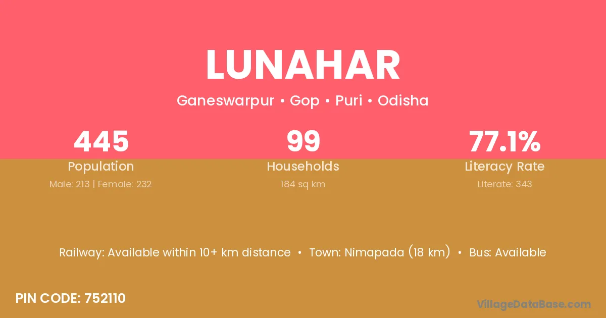 Cuttack (30 km) is the nearest town to Lunahar village for major economic activities and is located approximately 30 km away.
