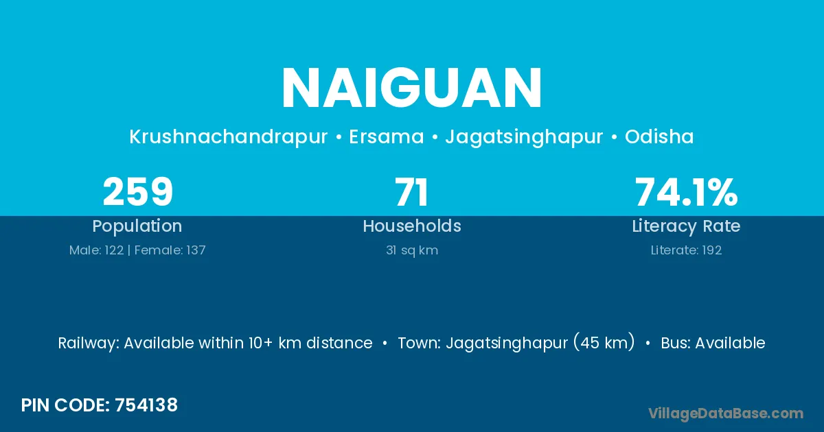 Cuttack (35 km) is the nearest town to Naiguan village for major economic activities and is located approximately 35 km away.
