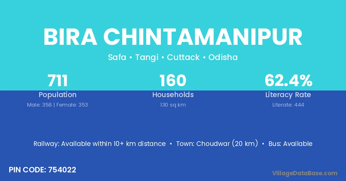 Choudwar (20 km) is the nearest town to Bira Chintamanipur village for major economic activities and is located approximately 20 km away.