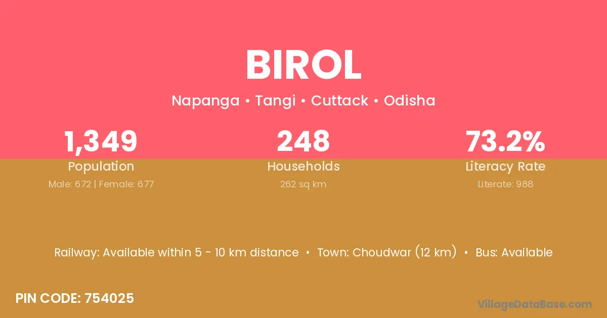 Choudwar (12 km) is the nearest town to Birol village for major economic activities and is located approximately 12 km away.