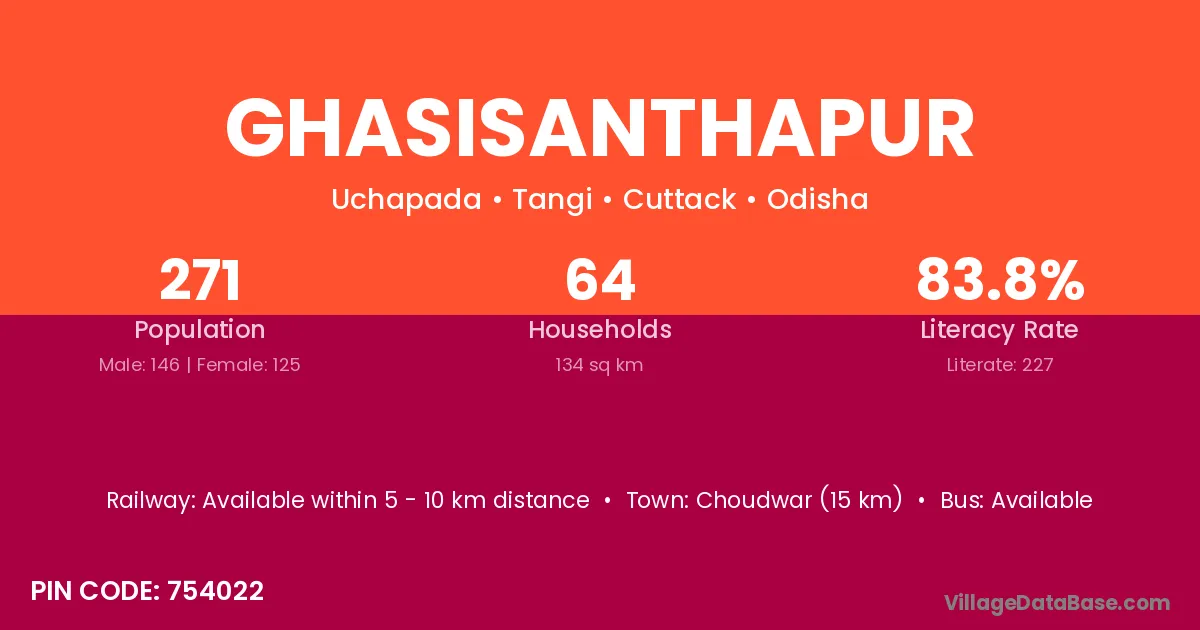Choudwar (15 km) is the nearest town to Ghasisanthapur village for major economic activities and is located approximately 15 km away.