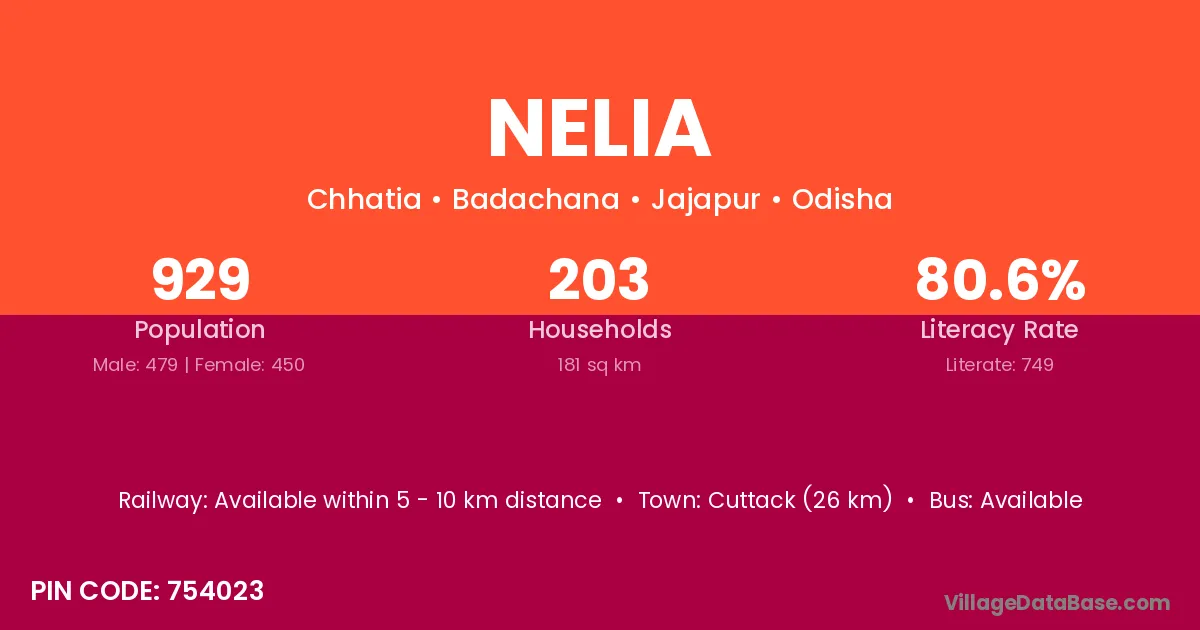 Choudwar (10 km) is the nearest town to Nelia village for major economic activities and is located approximately 10 km away.