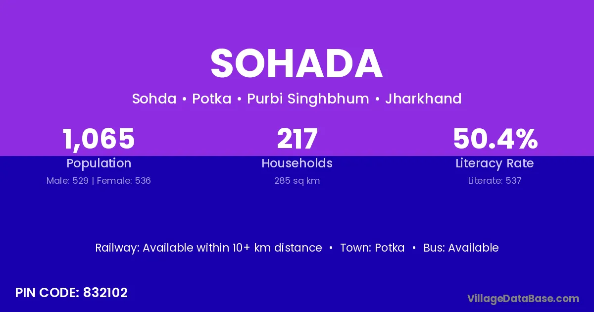 The literacy rate of Sohada village is 100.00%. Male literacy stands at 100.00% and female literacy at 0%.