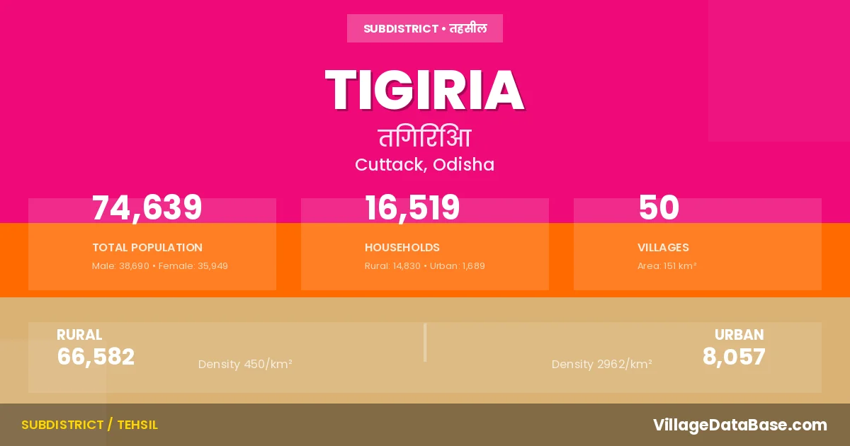 According to the 2011 census The total area of Tigiria Tehsil is 151 km², with a population of 74639 people. The population density is 495 inhabitants per square kilometre, and there are approximately 16519 houses in the sub district.