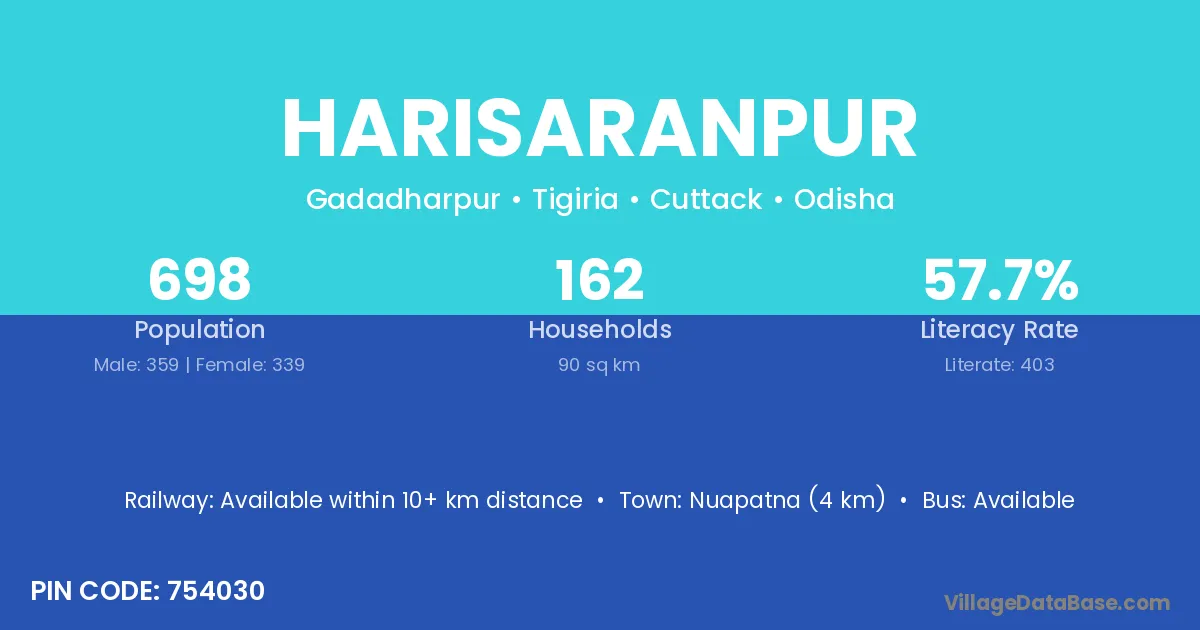 Nuapatna (4 km) is the nearest town to Harisaranpur village for major economic activities and is located approximately 4 km away.